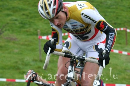 werden ebenfalls in Niederanven erwartet. Der amtierende Titelträger, René Birkenfeld hat im letzten Jahr die Quer-szene von jenseits der Mosel dominiert: 2 Siege (Lohne und Gelenau) sowie 6 Podestplätze haben ihm den Gesamtsieg beim Deutschland-Cup beschert und ein 7. Platz beim Weltcup in Hoogerheide haben dieser guten Saison ebenfalls eine positive internationale Note verpasst. Natürlich hat der junge Fahrer sich gut auf diese Saison vorbereitet, in der er seinem Meistertrikot alle Ehre machen will. Ein Etappensieg sowie ein 5. Gesamtrang bei der irländischen FDB Insurance Ras sowie Ehrenplätze bei einigen Mountainbike-Raids über mehrere Etappen (4. bei der Trans-Germany und 6. bei der Cape Epic in Südafrika) zeugen von einem fleissigen Sommer. Die Arbeit schein sich auszuzahlen, denn in diesem Winter belegte der Stevens-Fahrer schon den 2. und 3. Platz hinter Groenendaal bei den zwei internationalen Quers von Hamburg sowie ein dritter Platz beim TOI-TOI Cup in Louny hinter Zdenek Stybar. Derselbe Stybar hat ja bekanntlich letzten Sonntag das Weltcuprennen in Kalmthout gewonnen, bei dem Birkenfeld den 24. Rang belegte. Johannes Sickmüller, der deutsche Meister von 2006 und Zweiter hinter Birkenfeld im Januar 2007, ist ebenfalls MTB-Fahrer und sammelt eifrig Medaillen bei deutschen Meisterschaften in den beiden Disziplinen. Im letzten Jahr wurde er 13. beim Weltcup in Hoogerheide und er hat in diesem Jahr schon mehrere Ehrenplätze belegt: 2 x Vierter in Hamburg, 7. in Hlinsko, 9. in Pilsen. Im Jahr 2005 war Sickmüller schon einmal Zweiter in Contern, als er sich nur knapp in der letzten Runde von Klaas Vantornout geschlagen geben musste, bevor er einige Wochen später in Mühlenbach gewann.
