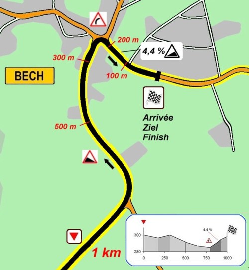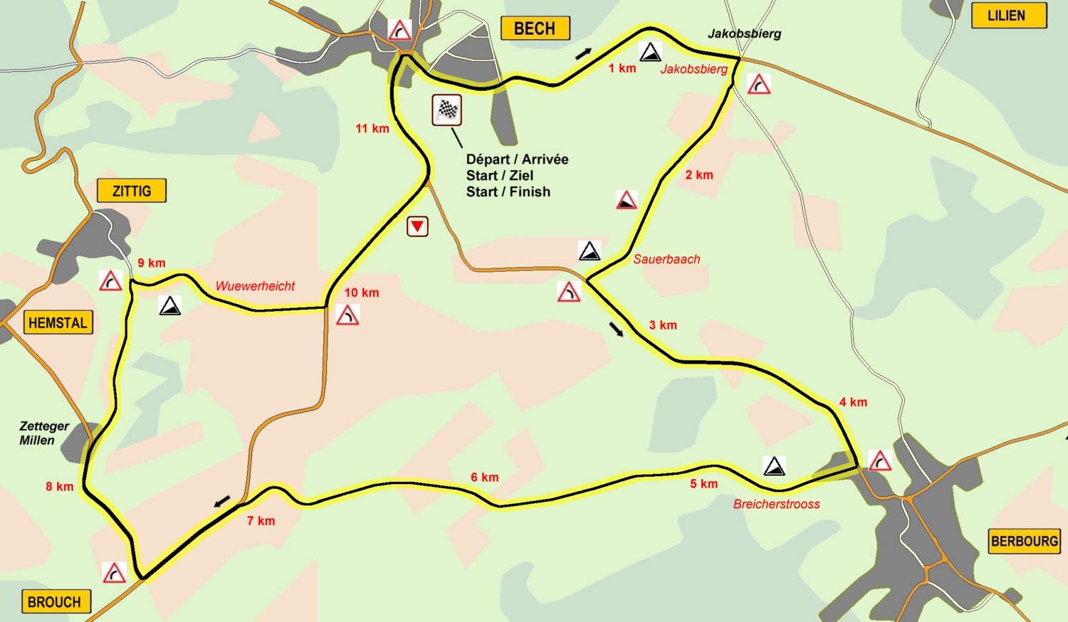 The races take place on three different hilly laps of 11.5, 4.5 and 9.3 kilometers. Start and Finish are located in Bech, rue Hanner Bra, next to the cultural centrum "Hanner Bra".